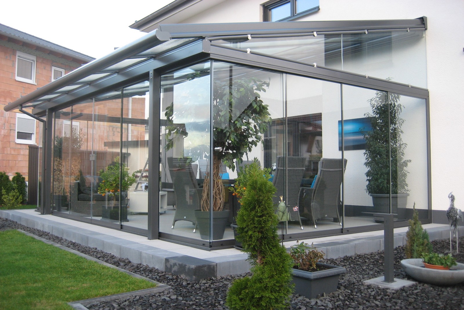 Transparenter Wetterschutz mit rahmenlosen Glaselementen, individuell auf Ihren persönlichen Geschmack abgestimmt.